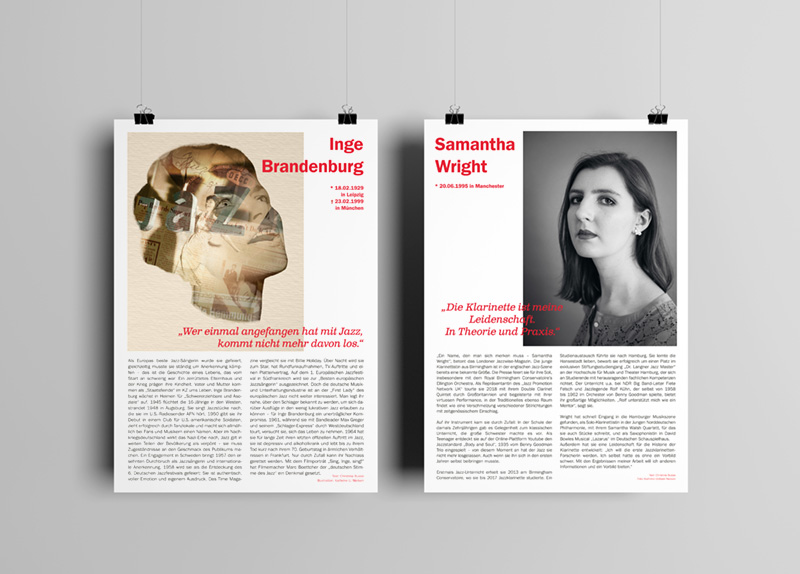En visuel hyldest til jazzens storheder og deres nutidige efterfølgere. Udstillingspanelerne forbinder fortid og nutid ved kraftfuldt at sidestille legender med nuværende musikere. Hvert panel kombinerer portrætter – nogle som illustrationer, nogle som fotografier – med biografiske tekster og citater fra kunstnerne. Det gennemgående design med rød typografi på hvid baggrund skaber en visuel ramme, der giver plads til de forskellige personligheder, samtidig med en klar designlinje. Udstillingen var del af en række arrangementer, med koncerter og filmvisninger.