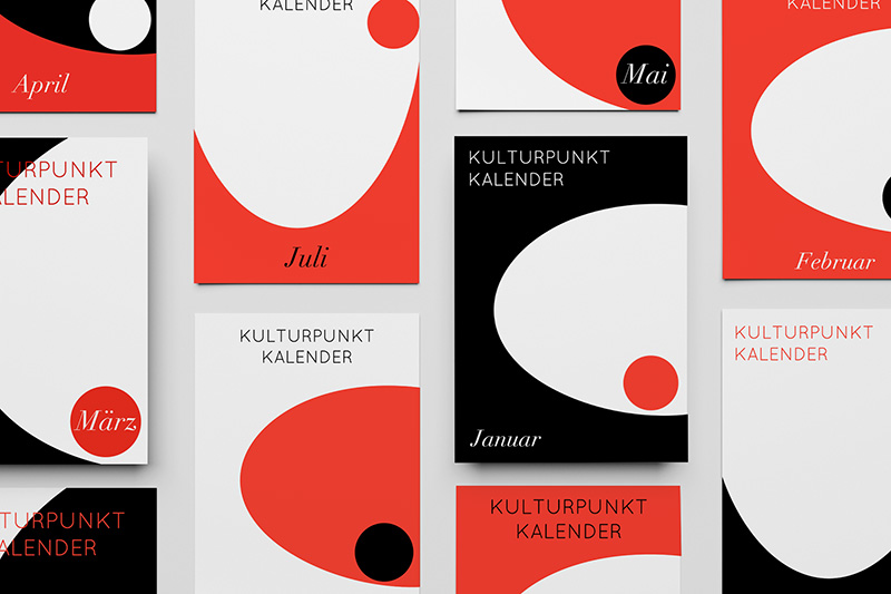 En rytmisk leg med form og farve til en månedlig eventkalender. Kulturcentrets kalenderrække kombinerer kontinuitet med månedlig variation. Kulturpunktets karakteristiske logo forbliver som et identitetsdannende element, mens de abstrakte formkompositioner i rød, sort og hvid omarrangeres hver måned. Hvert cover signalerer tydeligt programmets aktualitet, mens det legende design afspejler kulturcentrets kreative mangfoldighed.